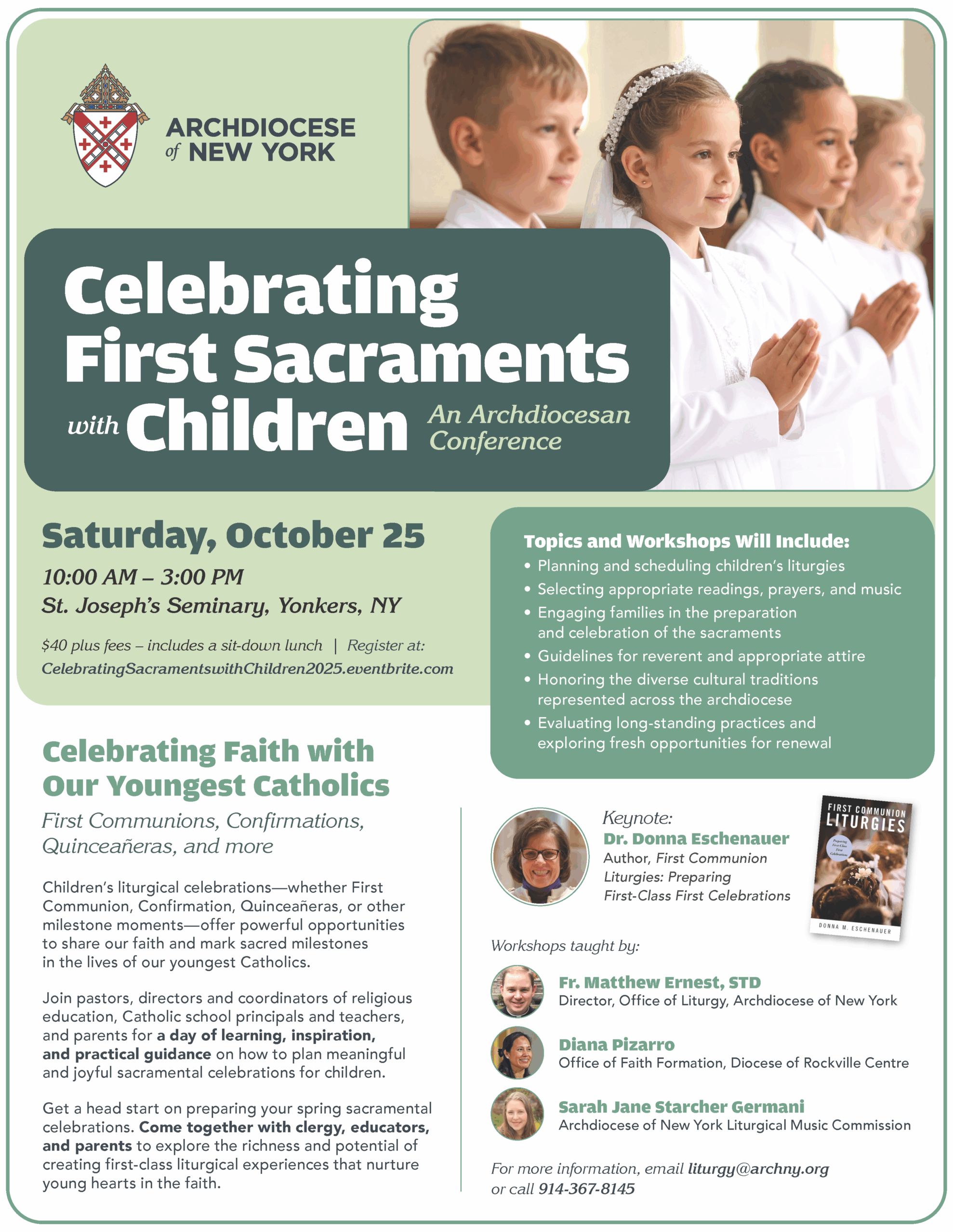 The Liturgy Office will present workshops on celebrating faith with our youngest Catholics. Join pastors, directors and coordinators of religious education, Catholic school principals and teachers, and parents for a day of learning, inspiration, and practical guidance on how to plan meaningful and joyful sacramental celebrations for children.